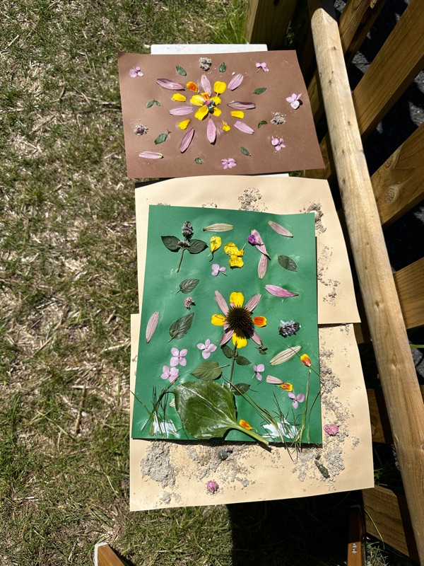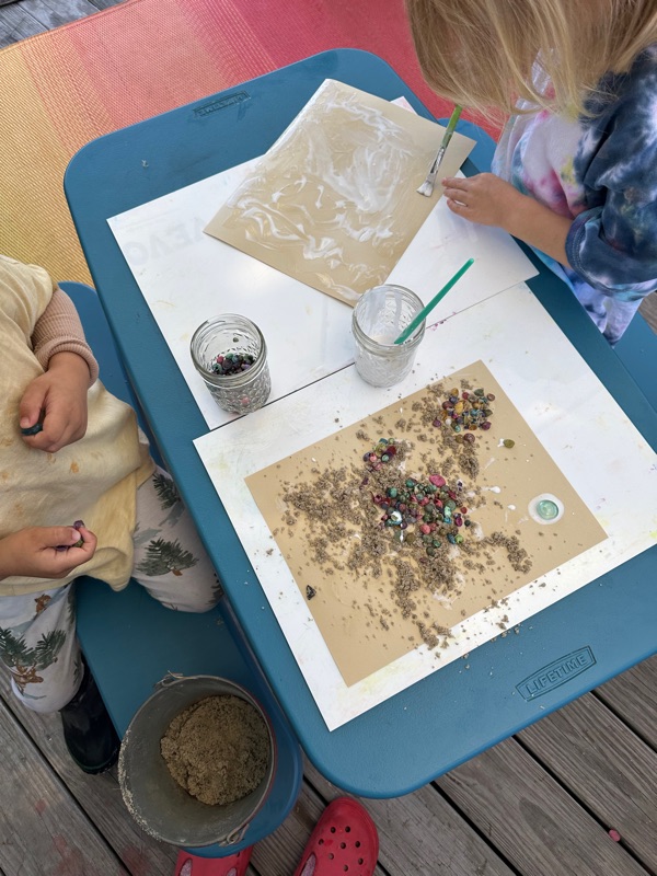 Today we made a simple project that required little set up. Using only thick colored paper, glue, paintbrushes, sand, shells, and other natural materials from the garden the children and I created some lovely art pieces. In fact, they were so immersed in this project they didn't want to stop for lunch time and requested more time for their art making. That is a success I would say.