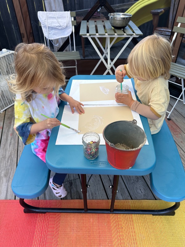Our sandbox has been a central part of the summer program at my house. Over the years I have carefully curated it with shells and rocks from the oceans we visit. This year I came across some beautiful small shells for sale in a shop in Eastham, MA called Buddha Bob's. We scooped the shells into little bags to take home for future art projects.