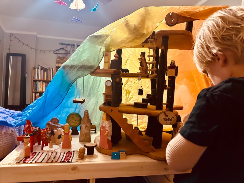 Nourished by the richness of the Waldorf Kindergarten, my son has been developing his own "puppet shows" with his toys, completely self directed. I sit and watch mostly and I don't worry about things I could be doing, because I feel so full of joy seeing him engrossed in imaginative storytelling.